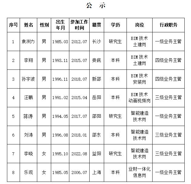 公司于2025年5月23日在公司官網(wǎng)對(duì)智能建造中心9名工作人員錄用情況進(jìn)行了公示,試崗期3個(gè)月,現(xiàn)8名同志試崗期考核通過、1名同志試崗期考核未通過。結(jié)合考核情況,根據(jù)公司相關(guān)規(guī)定,經(jīng)公司黨委研究,決定對(duì)袁洲力等考核通過的8名同志行政職務(wù)進(jìn)行公示。